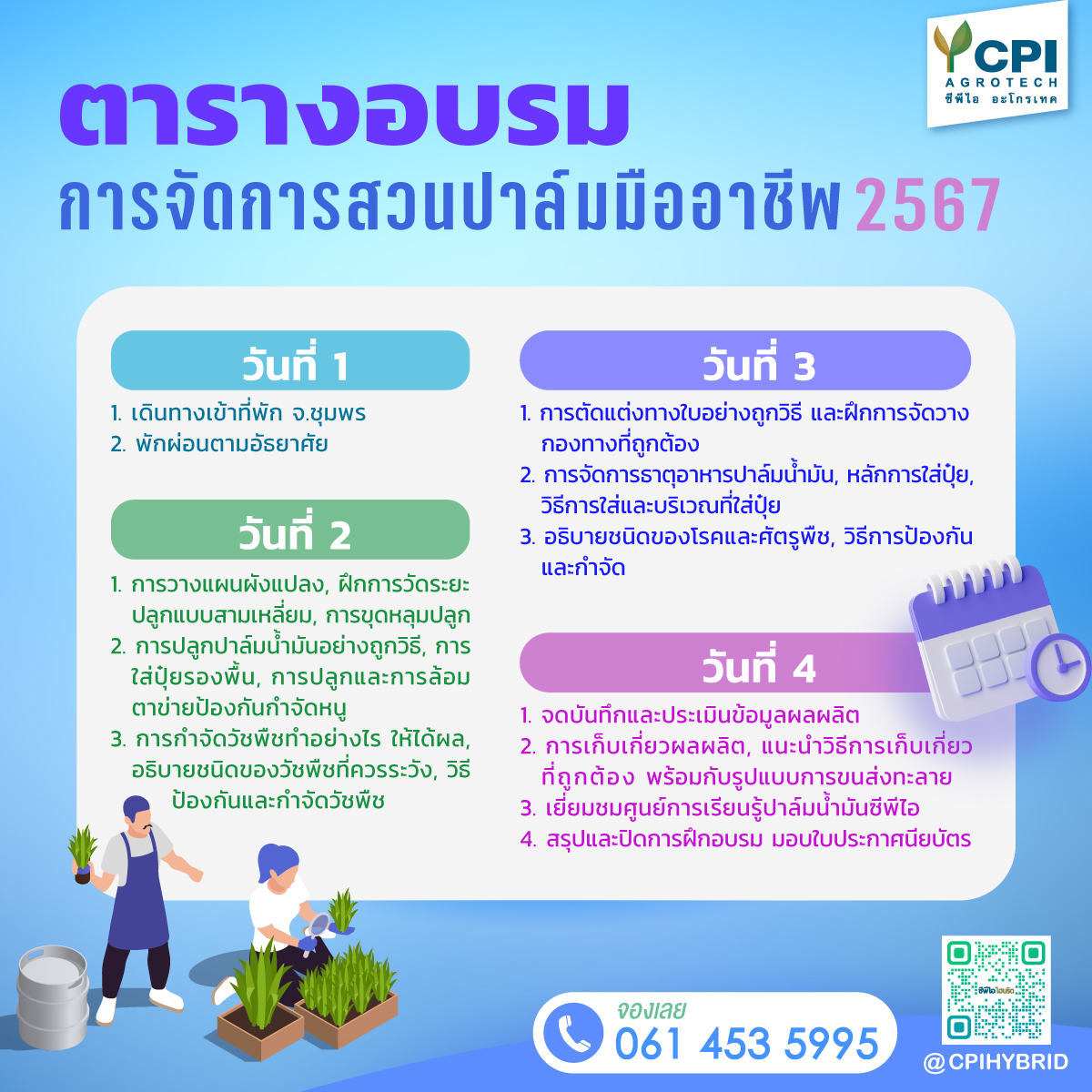 1. จดบันทึกและประเมินข้อมูลผลผลิต 2. การเก็บเกี่ยวผลผลิต, แนะนำวิธีการเก็บเกี่ยวที่ถูกต้อง พร้อมกับรูปแบบการขนส่งทะลาย 3. เยี่ยมชมศูนย์การเรียนรู้ปาล์มน้ำมันซีพีไอ 4. สรุปและปิดการฝึกอบรม มอบใบประกาศนียบัตร